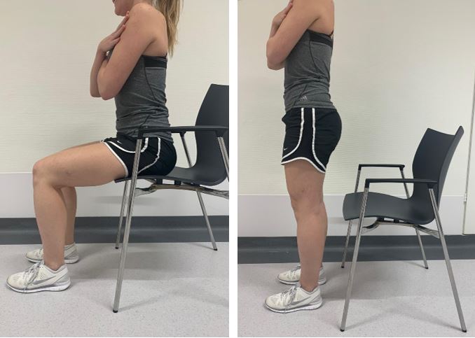 - Vervolgens zakt u door de knieën en raakt u met de billen de zitting van de stoel en kom vervolgens weer staan