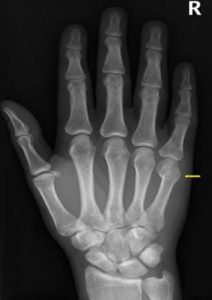 U heeft een breuk in het vijfde middenhandsbeentje (metacarpalia). De breuk zit in de buurt van de knokkel van uw pink. We behandelen deze breuk met tape en drukverband.