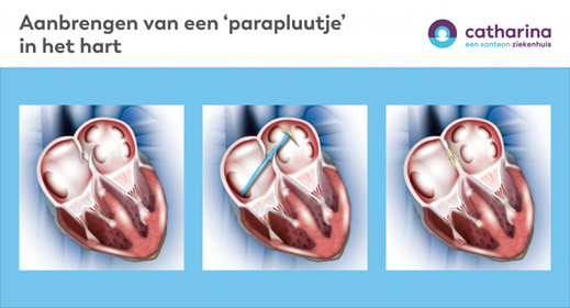 Op de behandelkamer wordt u aangesloten op bewakingsmonitoren. Het plaatsen van het parapluutje zal onder algehele narcose plaatsvinden, hiervoor is de anesthesioloog aanwezig bij de ingreep. Nadat u in slaap bent gebracht, wordt er door de anesthesioloog een beademingsbuisje in uw keel geplaatst. Hiermee wordt uw ademhaling overgenomen. Via de slokdarm wordt een echoslang ingebracht, hiermee kan het hart van meerdere kanten bekeken worden. De rechter of linker lies wordt gedesinfecteerd en in de ader wordt een buisje (sheath) ingebracht. Door deze sheath kan het parapluutje naar het hart worden geleid. De sheath wordt na de ingreep direct verwijderd. De insteekopening van deze sheath wordt eerst handmatig dichtgedrukt en vervolgens wordt er meestal een hechting geplaatst en tevens een drukverband aangelegd. De beademingsbuis wordt na de behandeling verwijderd zodra u weer zelfstandig ademt.