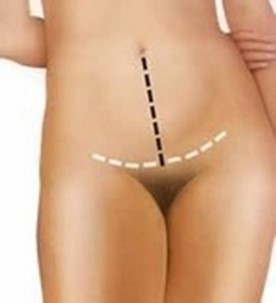 verticale lijn, snede bij een grote baarmoeder of bij baarmoederkanker.