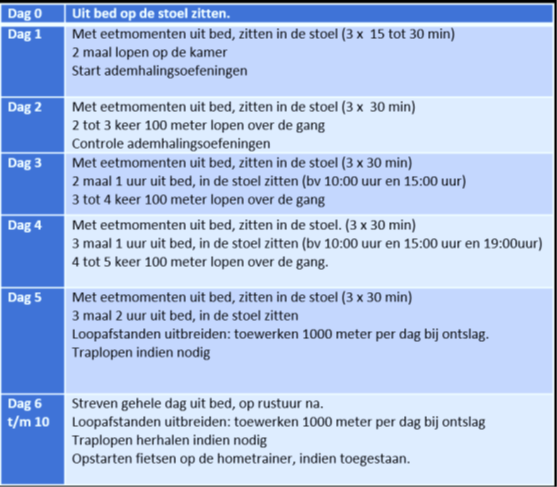 Na de operatie is het belangrijk dat u zo snel mogelijk gaat bewegen. Dit zal gedurende de opname steeds verder uitgebreid worden. Bewegen is niet alleen belangrijk om trombose te voorkomen, maar ook om verlies van spierkracht tegen te gaan, zodat u zo snel mogelijk onafhankelijk bent van de zorg van anderen. Ook is uit onderzoek gebleken dat de kans op luchtweginfecties verkleint wanneer u goed rechtop zit en goed doorademt. Een luchtweginfectie zal de duur van de opname verlengen en is ongunstig voor de wondgenezing doordat het de zuurstofvoorziening verminderd. Om de kans op deze complicatie nog verder te verkleinen is het de bedoeling dat u meermaals per dag de ademhalingsoefeningen uitvoert.