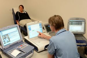 Roei ergometer: er komt spanning te staan op de geleidingsdraden |