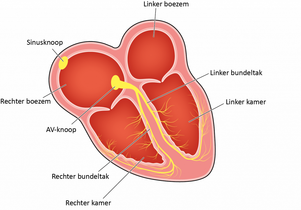 De belangrijkste functie van het hart is het rondpompen van bloed door het hele lichaam. Zo worden alle organen voorzien van zuurstof en voedingsstoffen en ontdaan van afvalstoffen. Het samentrekken van de hartspier wordt elektrisch geregeld vanuit de natuurlijke pacemaker van het hart, de sinusknoop. Deze bevindt zich bovenaan in de rechterboezem van het hart. Wanneer de sinusknoop elektrische signalen afgeeft aan de beide bovenste holten van het hart, de boezems, trekken deze gelijktijdig samen. Door deze samentrekking worden de onderste holten, de hartkamers, met bloed gevuld. De elektrische prikkels gaan daarna door naar een tussenstation, de AV knoop. Deze ligt tussen de boezems en de kamers. Het elektrisch signaal beweegt zich vervolgens snel voort naar de hartkamers via een elektrisch geleidingssysteem dat bestaat uit de bundel van His en de rechter- en linkerbundeltak. De beide hartkamers trekken hierdoor gelijktijdig samen en pompen bloed door het lichaam. Dit is een hartslag. Na een korte pauze begint de cyclus opnieuw. Het hart klopt in rust ongeveer 60 tot 80 keer per minuut. Bij inspanning loopt de snelheid op tot soms wel 180 tot 190 slagen per minuut bij jonge getrainde mensen. Bij ouderen ligt dit een stuk lager.