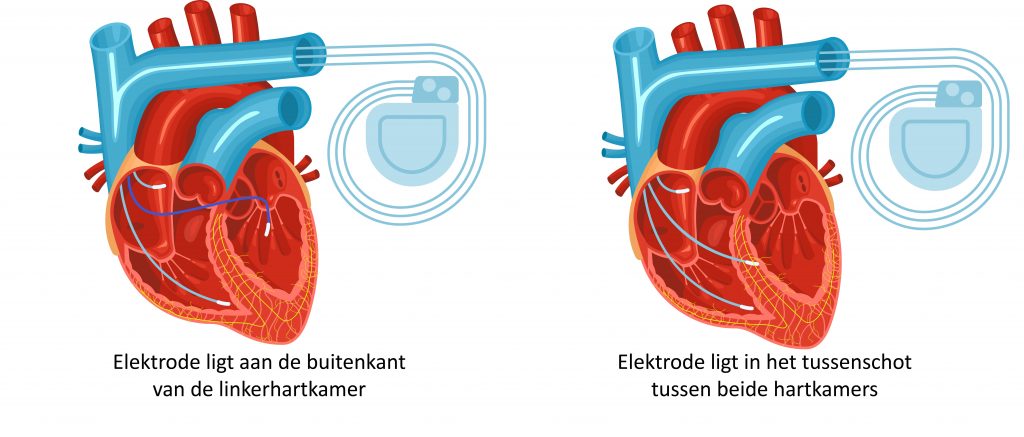 De huid wordt plaatselijk verdoofd in de plooi tussen de schouderspier en de borstspier. De arts maakt een kleine snee door het onderhuidse vetweefsel tot net boven de spieren. De elektrode wordt ingebracht via een kleine zijtak van de grote ader die onder het sleutelbeen loopt. Als deze ader te klein is, wordt de grotere ader onder het sleutelbeen aangeprikt. De arts voert de elektrode op via de ader tot in de rechterhartkamer. Met röntgenstraling wordt het inbrengen van de elektrode gevolgd. Het uiteinde van de elektrode bestaat uit een heel klein schroefdraadje dat in de binnenwand van de rechterhartkamer wordt bevestigd. De elektrode wordt doorgemeten. Zo wordt gecontroleerd of deze elektrisch goed contact maakt met het hart. Zo niet, dan wordt de elektrode verplaatst.