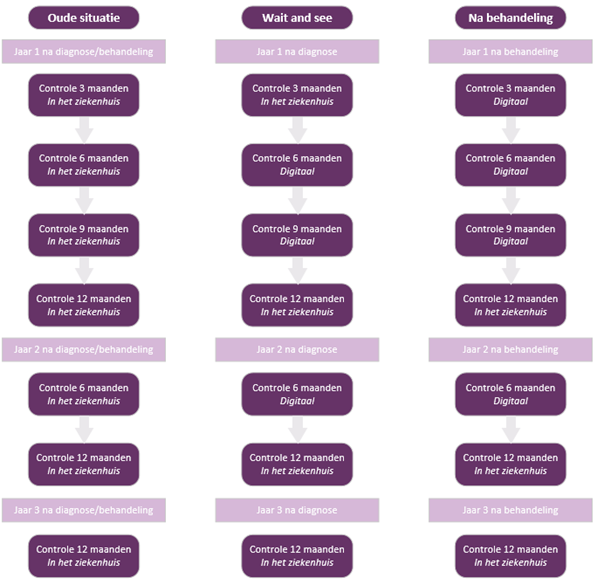 Hieronder treft u een schema om meer inzicht te geven in welke controles in het ziekenhuis zijn en welke digitaal via de computer/tablet/telefoon. Links ziet u de ‘oude situatie’ zoals we de zorg de afgelopen jaren geleverd hebben. Rechts ziet u 2 kolommen over de ‘studie situatie’ zoals we de zorg de komende jaren gaan leveren. Afhankelijk van uw behandelplan (wait and see of eerst behandeling) volgt u een van de kolommen.