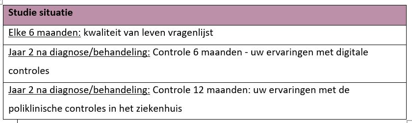 Naast de vragenlijst over uw symptomen die u voor elke digitale controle via de computer/tablet/telefoon kunt invullen, vragen wij u om eenmalig een vragenlijst over uw ervaringen met digitale monitoring in te vullen. Ook deze vragenlijst kunt u invullen in de ‘mijn-ziekenhuis omgeving’ van uw ziekenhuis op uw computer/tablet/telefoon. Dit geeft ons veel informatie over hoe wij voor u zorgen en of u voldoende weet wat u te wachten staat. Het invullen van deze vragenlijst kost ongeveer 5 minuten. Daarnaast willen wij eenmalig uw ervaringen met de poliklinische controles die in het ziekenhuis plaatsvinden weten. Ook dit geeft ons veel informatie over hoe we voor u zorgen. Als laatste krijgt u 2 keer per jaar een vragenlijst over hoe u uw kwaliteit van leven ervaart. Dit geeft ons inzicht in wat er speelt in uw leven en of wij u daarbij kunnen ondersteunen. Hieronder ziet u een schema van de vragenlijsten zoals hierboven omschreven.