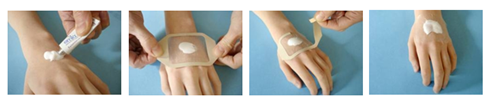 - Stap 5: Verwijder de resterende papieren rand aan de niet-kleefzijde van de pleister en druk de randen goed aan. Het kan zijn dat de pleister te klein is om de crème volledig te bedekken, waardoor de crème onder de pleister vandaan komt. In dit geval kunt u een tweede pleister plakken, als dakpan over de eerste pleister heen. Eventueel kunt u i.p.v. de Tegaderm-pleister ook gebruikmaken van vershoudfolie om de arm of hand te omwikkelen.