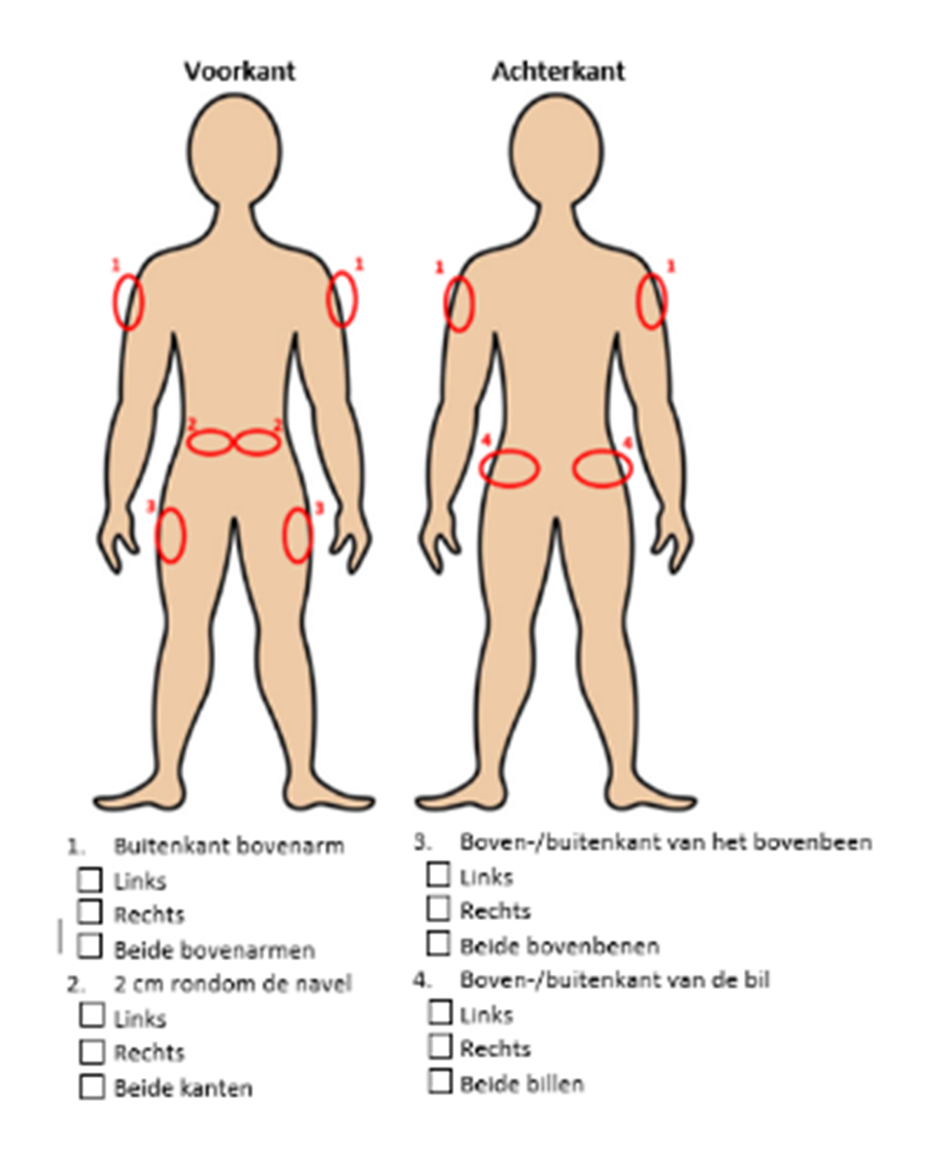 - Stap 3: Breng de Emla crème aan op de plaatsen die onder dit stappenplan zijn aangevinkt door per plaats één keer in de tube te knijpen. Wrijf de crème niet in.