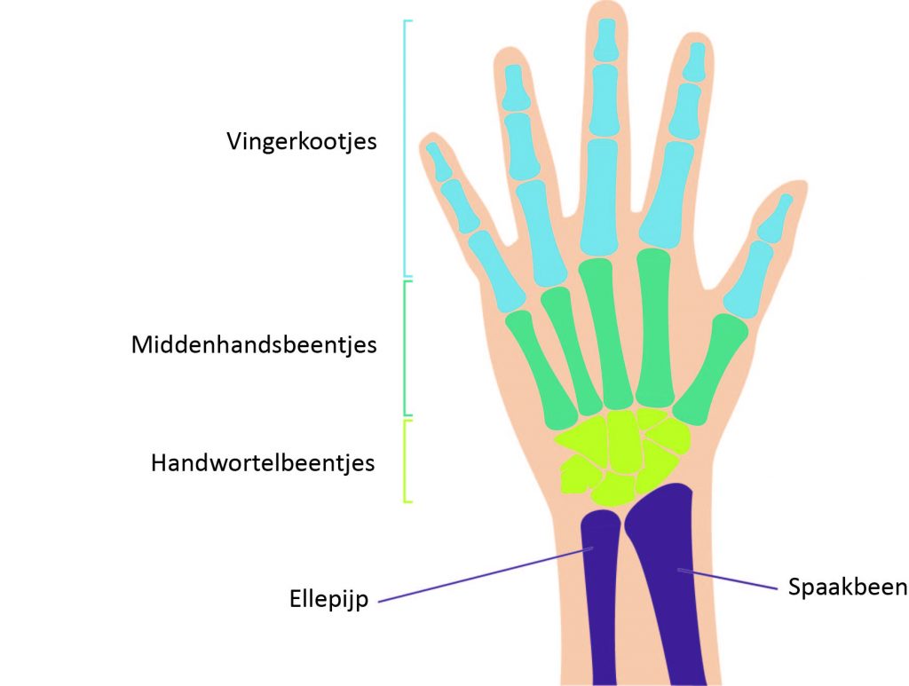 - De handwortelbeentjes: dit zijn de 8 beentjes die samen de pols vormen. Deze beentjes staan langs de ene zijde in verbinding met de middenhandsbeentjes en aan de andere kant met de onderarmbotten: het spaakbeen en de ellepijp Al deze kleine beentjes worden bijeen gehouden door bandjes.