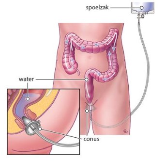 Indien bovenstaande u onvoldoende helpt en de klachten aanhouden, kunt u doorverwezen worden naar een stoma verpleegkundige. De stoma verpleegkundige kan u alles vertellen over darmirrigatie, ook wel darmspoelen genoemd. Darmirrigatie wordt toegepast bij problemen met het lozen van de ontlasting. Met een spoelsysteem wordt op gecontroleerde wijze water via de anus in een groot deel van de dikke darm gebracht. Door het geleidelijk vullen van de darm met water, mengt de aanwezige ontlasting zich met het water. Het mengen van water met de ontlasting stimuleert op een natuurlijke wijze de darmbeweging en wekt aandrang voor het lozen van de ontlasting op. Zo kunt u met darmirrigatie een groot deel van de darm in een keer leeg spoelen, zodat u uren lang (soms tot wel 24uur) geen ontlasting heeft. U bent ongeveer een halfuur tot één uur bezig met het darmspoelen.