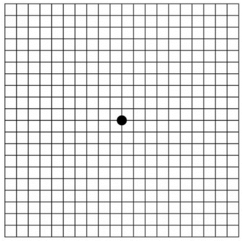 Test met ieder oog apart: kijk naar de zwarte stip en merk op of u nieuwe vervorming in de lijnen van het raster ziet.