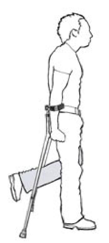 - Zet nu uw gezonde been één stap voorbij het aangedane been, maar steun daarbij alleen op de krukken (figuur 4).