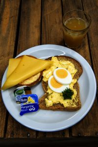 Vaste voeding, voorbeeld 1: een snee brood of rozijnenbrood, een beschuit of knäckebröd, boter, plakje kaas, eiersalade of tonijnsalade en een eiwitrijke vruchtensap = 22 gram eiwitten.