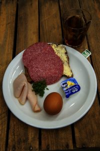 Vaste voeding, voorbeeld 2: een snee eiwitrijk brood, boter, dubbel beleg vleeswaren en een ei = 21 gram eiwitten