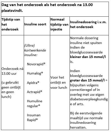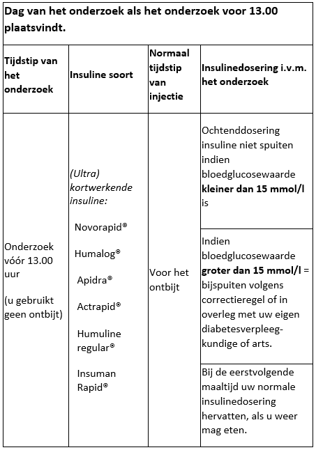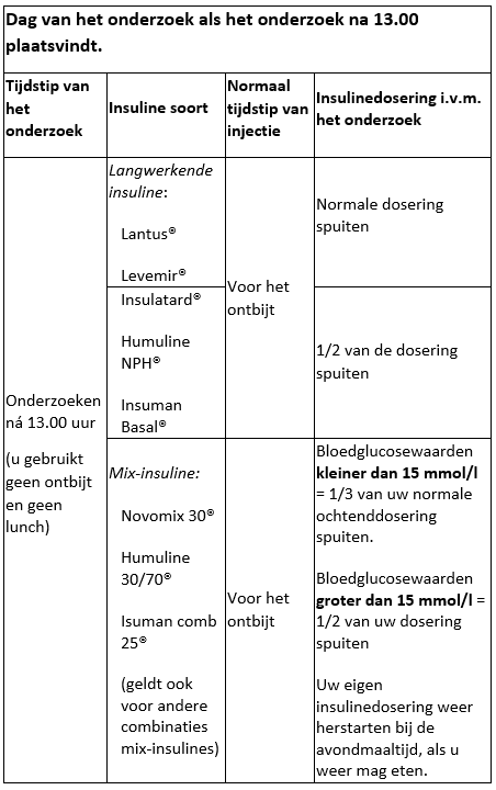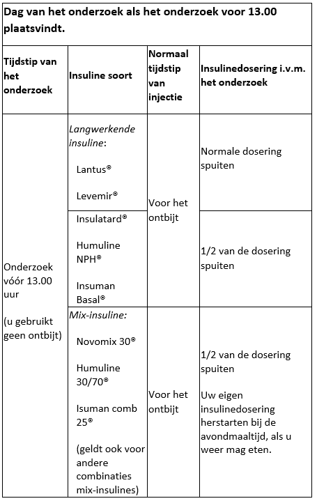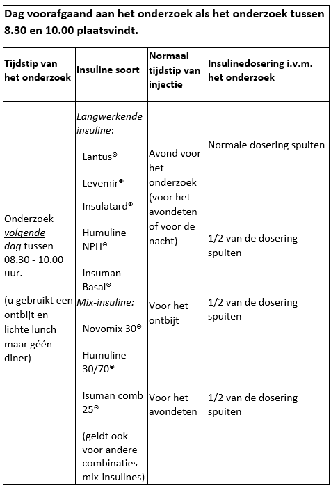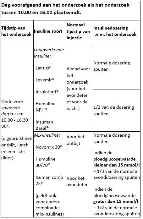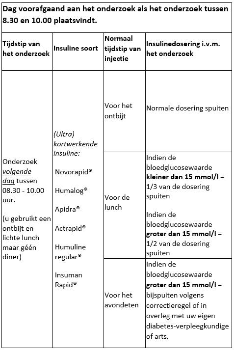 Indien u naast uw insuline ook tabletten en/of Byetta of Victoza voor uw diabetes gebruikt, verwijzen we u naar de folder: ‘Onderzoek met MOVIPREPvoorbereiding bij diabetes mellitus (tabletten, Byetta of Victoza)‘