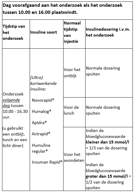 Op de dag van het onderzoek neemt u druivensuiker mee. Mocht u last krijgen van hypoverschijnselen (lage bloedsuiker), neemt u 4 tabletten druivensuiker in om de bloedglucosewaarden weer te laten stijgen.