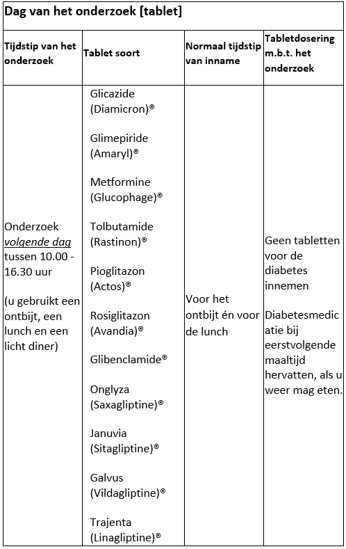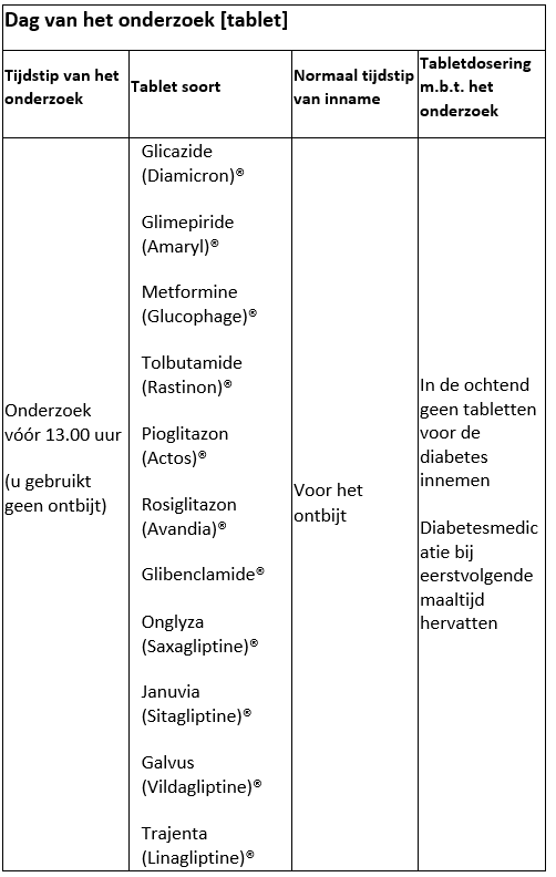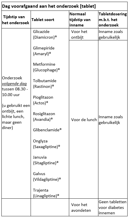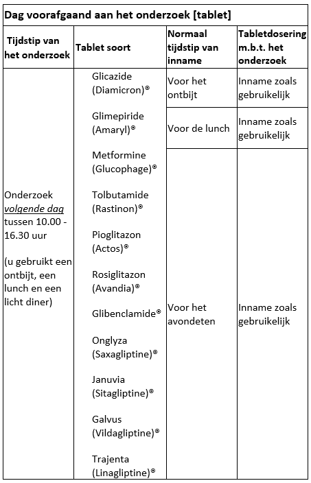Op de dag van het onderzoek neemt u druivensuiker mee. Mocht u last krijgen van hypoverschijnselen (lage bloedsuiker), dan neemt u 4 tabletten druivensuiker in om de bloedglucosewaarden weer te laten stijgen.