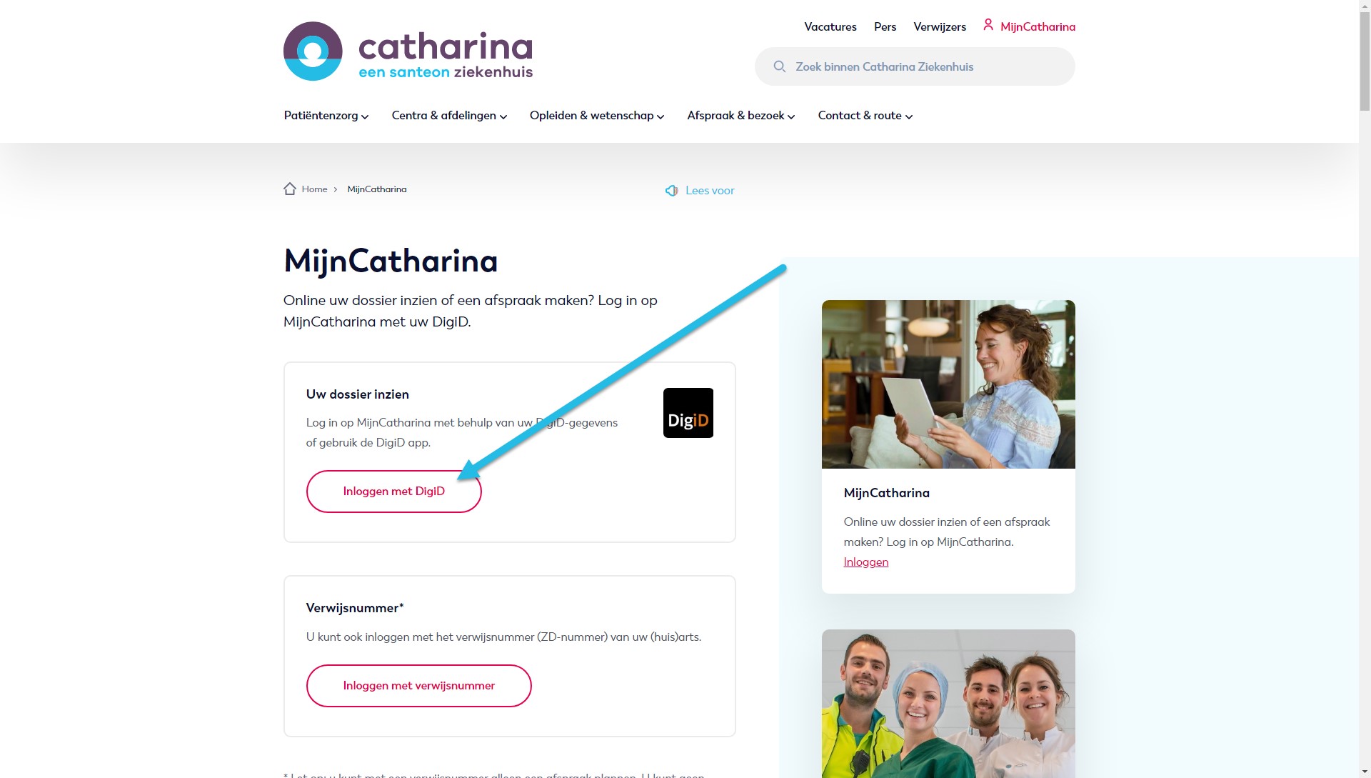 Dit doet u met uw DigiD via www.mijncatharina.nl. Vul uw DigiD-gebruikersnaam en -wachtwoord in. Voer daarna de code in die u via een sms-bericht op uw telefoon ontvangt, of gebruik de DigiD-app. U krijgt dan toegang tot uw persoonlijke MijnCatharina-omgeving.