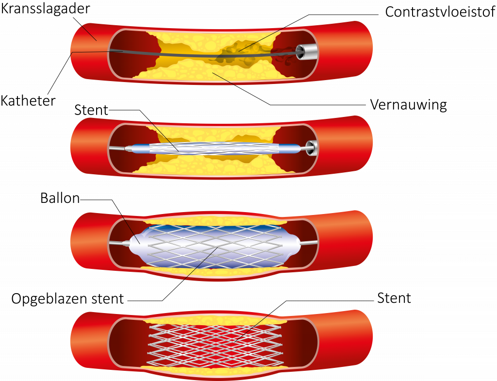 In veel gevallen (meer dan 90%) plaatst de cardioloog een stent. Dit is een metalen cilindertje van gaas, te vergelijken met een veertje in een ballpen. Bij het aanbrengen is de stent op de ballonkatheter bevestigd.