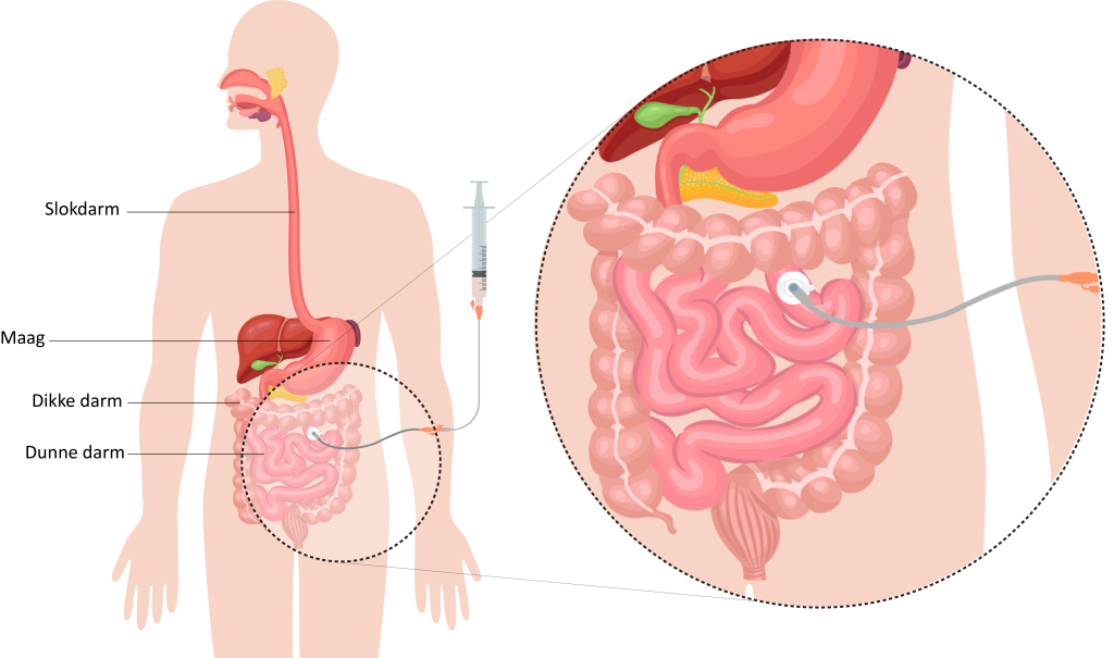 De afkorting PEJ staat voor Percutane Endoscopische Jejunostomie. Dit is een voedingssonde die met behulp van een endoscoop (flexibele slang), door de huid, in de dunne darm (jejunum) wordt geplaatst zoals op Figuur 1. Twee schijfvormige fixatieplaatjes (één aan de binnenzijde van de dunnedarmwand en één aan de buitenkant op de huid van de buik) zorgen ervoor dat de PEJ sonde er niet uitvalt.