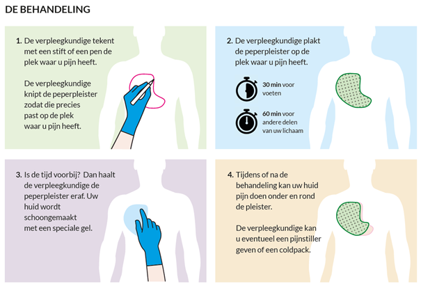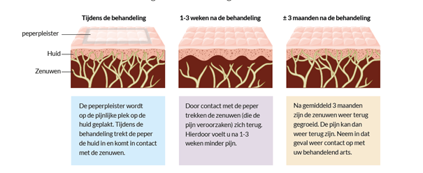 Na de behandeling met de peperpleister kan de huid rood zijn. Ook kunt u last hebben (branderig of prikkend gevoel) op de plek waar de peperpleister zat. Het behandelde gebied kan enkele dagen gevoelig zijn voor warmte (warme douche of bad, flinke inspanning enz.). Eventuele pijn als gevolge van de behandeling is in het begin het hevigst en neemt doorgaans binnen enkele dagen vanzelf af. Het gebruik van een koude pakking kan dan verlichting geven met eventueel extra pijnmedicatie. Zorgt u van tevoren dat u een koude pakking in huis heeft. De pijn neemt gemiddeld na 1-3 weken af (soms al na 2 dagen) en dit kan 12 weken aanhouden. Na 12 weken kan de behandeling met Qutenza® worden herhaald.