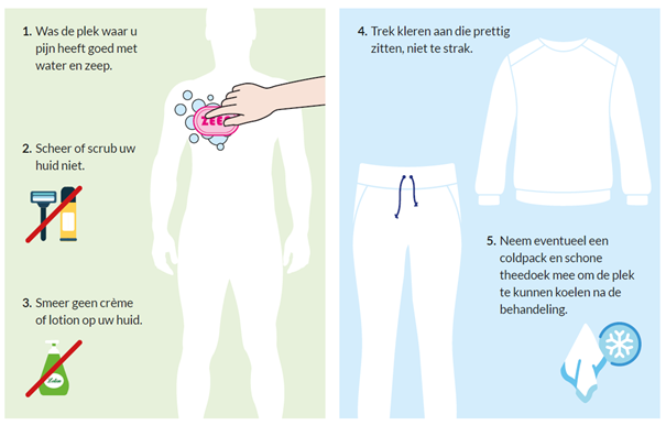De verpleegkundige vraagt u om de kleding die het pijngebied bedekt, te verwijderen. Eventuele aanwezige haargroei knippen we weg.
