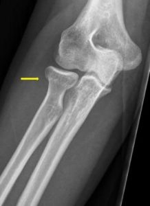 You have a small fracture of the head or neck of your radius, which is one of the bones in your elbow. We treat this fracture with a pressure bandage and a sling.