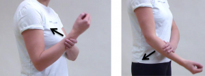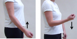 After 4 weeks, you can start forearm rotations. Put your elbow at your side, do not hold it in the air. Bend your elbow to 90 degrees. Slowly rotate your palm up and down until you feel a mild to moderate stretch. You can use your other arm to assist if necessary. Do not push into pain.