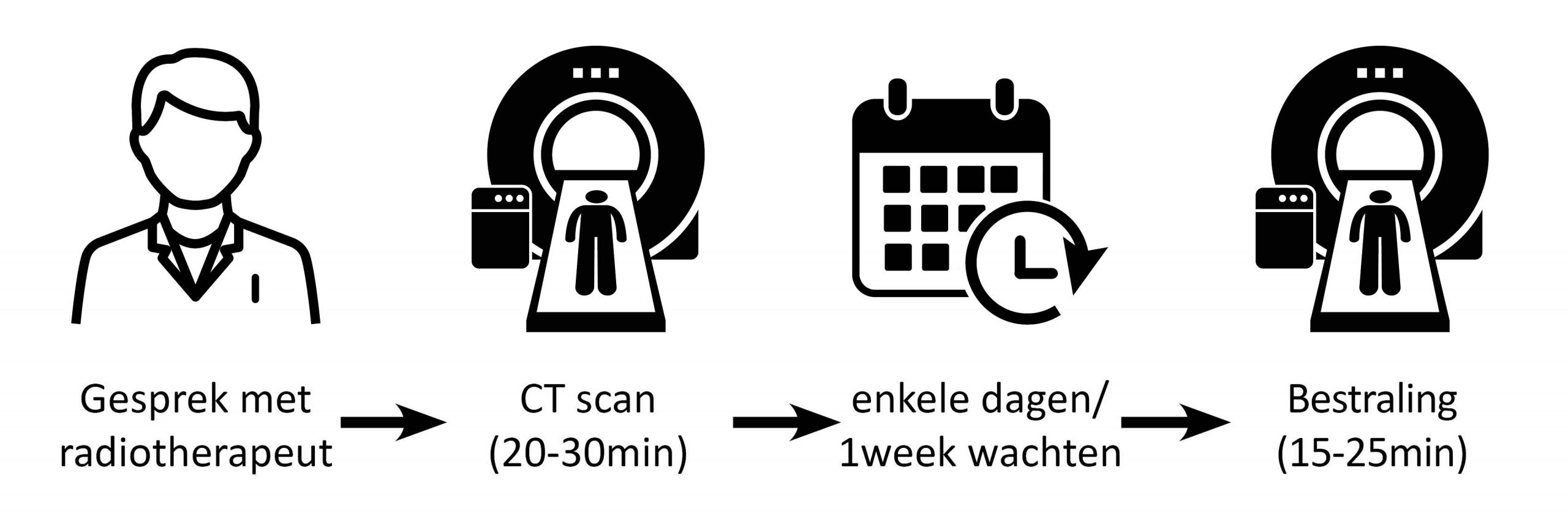 De voorbereidingen kosten tijd. Hierdoor begint de bestraling meestal een week na het maken van de CT-scan.