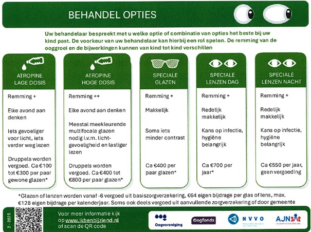 Bij uw kind is een progressieve vorm van myopie geconstateerd. Voorheen werd bij een progressieve myopie alleen de brilsterkte aangepast. Uit diverse onderzoeken blijkt echter dat er verschillende behandelingen zijn om de progressie van de myopie te remmen en het risico op complicaties op oudere leeftijd te verminderen.