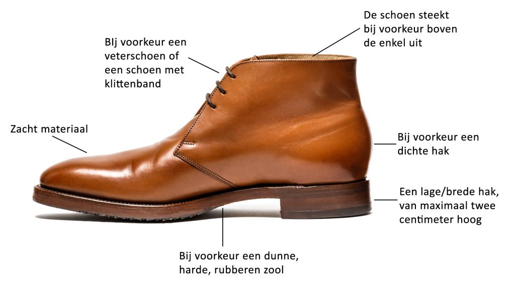Goede schoenen helpen bij het verdelen van het lichaamsgewicht, waardoor de voet beter afgewikkeld kan worden. Daarnaast zorgen schoenen voor bescherming, geven ze stabiliteit en zorgen ze ervoor dat u niet uitglijdt. Door al deze factoren wordt de kans op vallen minder. Het is dus van groot belang dat u goede schoenen (zie voorbeeld) meeneemt tijdens uw ziekenhuisopname.