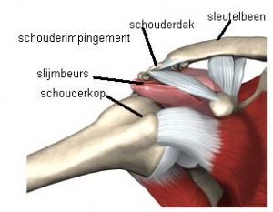 Als deze ruimte te nauw is kunnen de slijmbeurs en de pezen die hier tussen lopen geïrriteerd raken; er ontstaat dan een slijmbeursontsteking of peesontsteking. In medische termen noemt men dit impingement van de schouder (zie afbeelding).