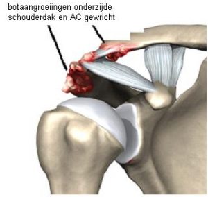 Ook wanneer de ruimte onder het schouderdak vernauwd is door botaangroei aan de onderzijde van het schouderdak kunnen de slijmbeurs en de spieren geïrriteerd raken en daardoor iets opzetten. Deze bot aangroeiingen ontstaan door verouderings- of slijtageprocessen in de schouder. Ook kan het gewricht tussen het schouderdak en het sleutelbeen (AC gewricht) iets versleten zijn en botaangroeiingen aan de onderzijde hebben. Dit kan vernauwing veroorzaken.