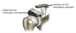 Wanneer het gewricht tussen schouderdak en sleutelbeen ook botaangroeiingen vertoont of versleten is, kan er tegelijk een stukje bot verwijderd worden van het uiteinde van het sleutelbeen.
