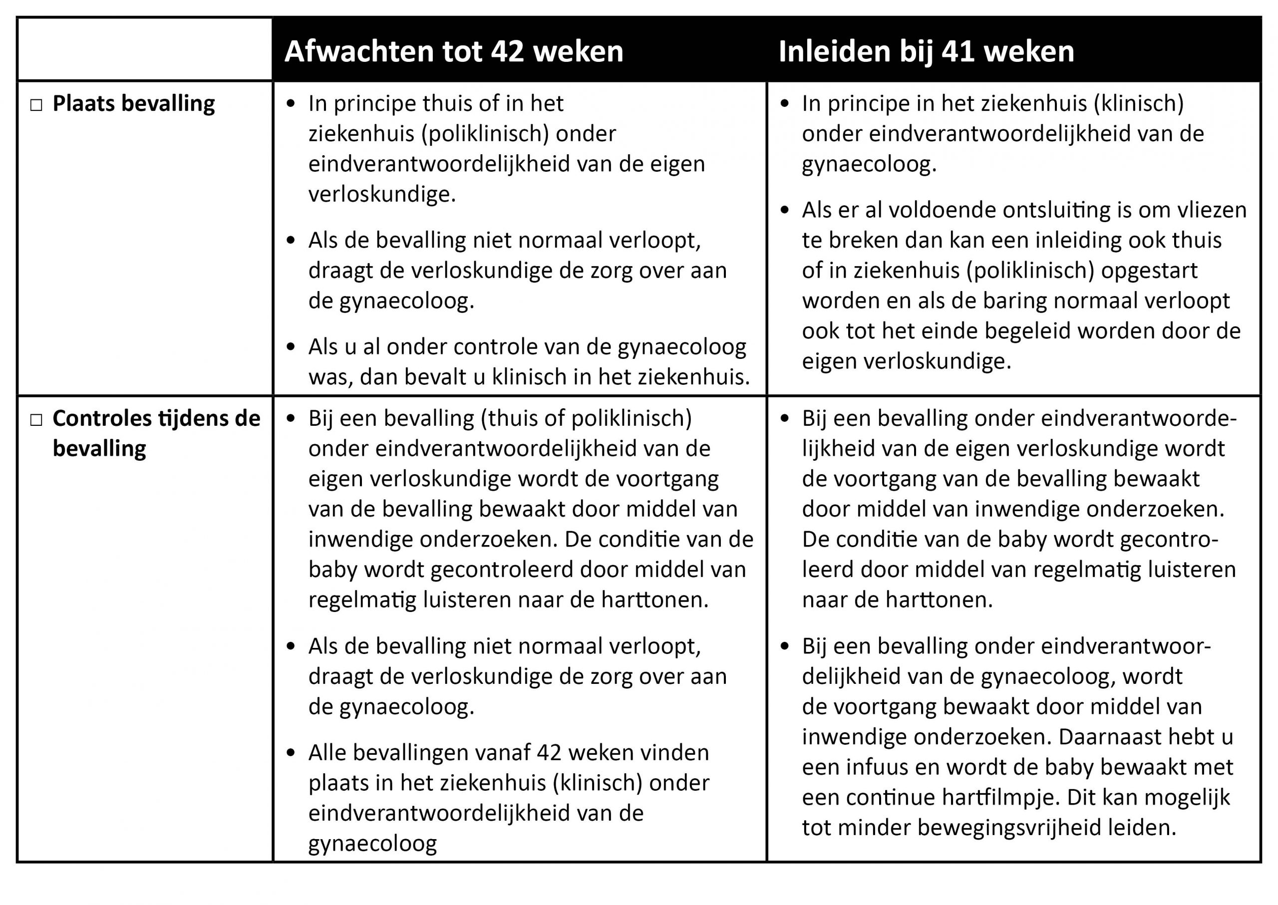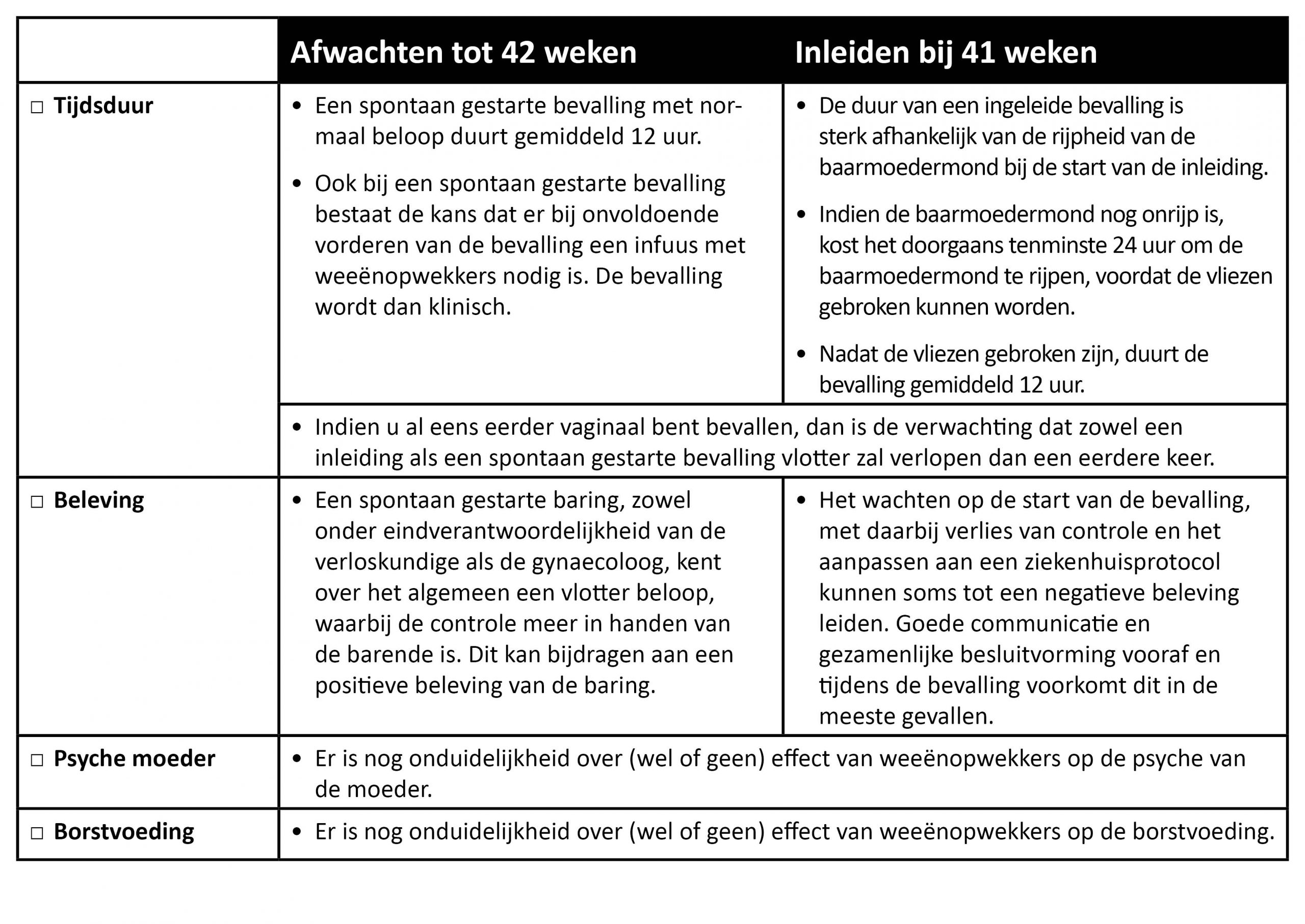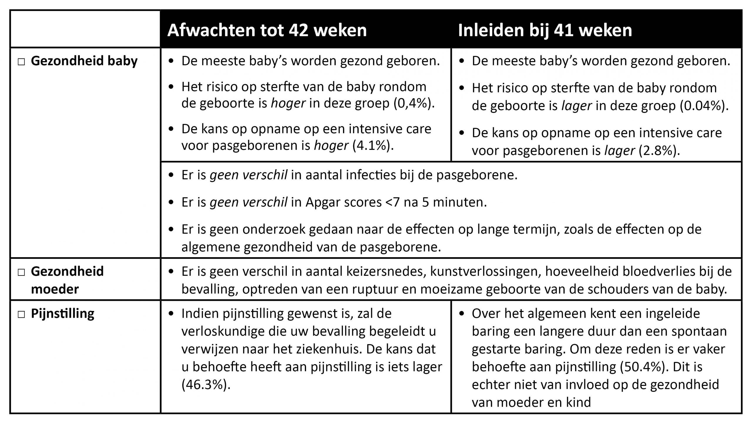 U hebt dan samen een gesprek gehad over de voor- en nadelen van zwanger zijn langer dan 41 weken en ook de voor- en nadelen van een inleiding besproken. De gegevens in de keuzehulp kunnen u helpen bij het maken van een keuze.
