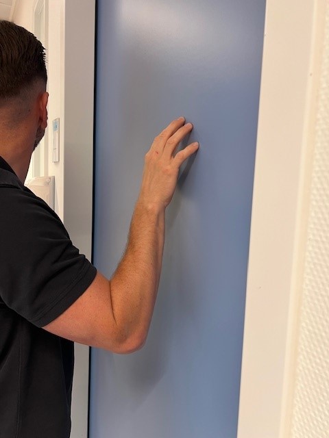 - Vanaf week 3 mag u oefenen met de vingertoppen langs de muur omhoog te krabbelen (niet hoger dan 90 graden)