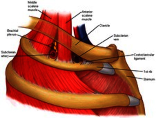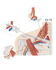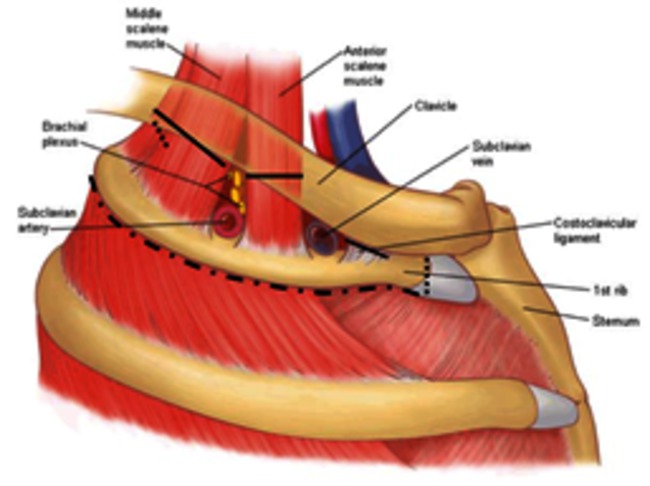 De drie anatomische ruimtes waar de beknelling plaats kan vinden zijn de scalenus driehoek, de costoclaviculaire ruimte en de pectoralis minor ruimte (zie afbeelding 1).