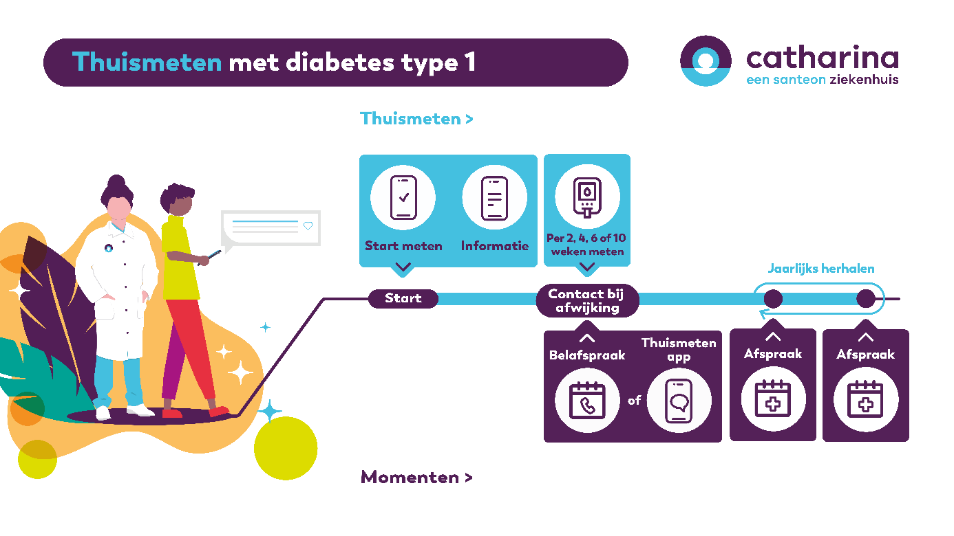 Bij diabetes type 1 is het belangrijk om uw glucosewaarden in de gaten te houden. Met de app Thuismeten kan de zorgverlener op afstand uw gezondheid in de gaten houden. Dat is prettig als het goed gaat. Als het minder goed gaat, heeft u snel contact met uw zorgverlener. U kunt via een app op uw telefoon uw metingen doorgeven. In de app vindt u ook informatie en video’s over diabetes en leefstijl.