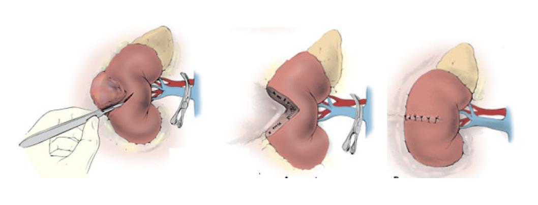 Bij een partiële nefrectomie (zie figuur 2) wordt een gedeelte van de aangedane nier weggehaald. Een groot deel van de nier blijft behouden. Soms blijkt tijdens de operatie dat het technisch onmogelijk is om de nier te behouden, bijvoorbeeld vanwege de plaats en grootte van de afwijking. In dat geval wordt alsnog de hele nier verwijderd. Ook kan tijdens de operatie een bloeding ontstaan, waardoor de nier in zijn geheel verwijderd moet worden.