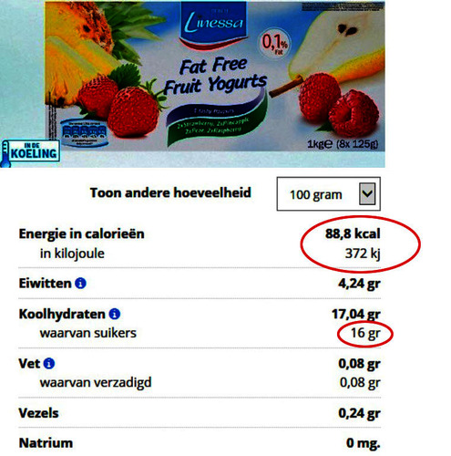 Het is belangrijk te kiezen voor magere of halfvolle varianten, bij voorkeur naturel producten of producten zonder toegevoegde suikers. Op het etiket van de producten kunt u de voedingswaarden lezen. Melkproducten mogen maximaal 60 calorieën (kcal) per 100 ml bevatten. Er zijn een aantal producten die boven de 60 kcal/100ml zitten, welke wegens de hoeveelheid eiwit geschikt zijn om te gebruiken. Hiervoor wordt als richtlijn < 6g suiker per 100 ml gehanteerd. Zie hiervoor informatie op de Catharina Obesitascentrum app. In onderstaand voorbeeld kunt u zien hoe u dat getal kunt aflezen.