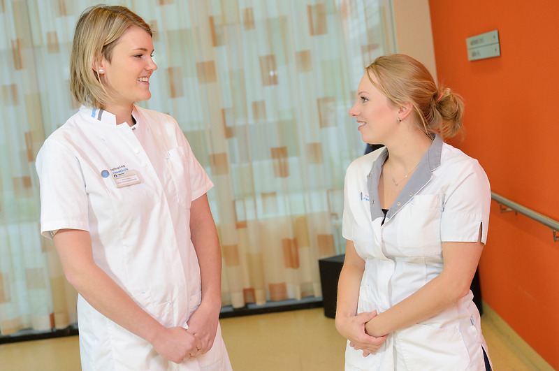 Hoewel het onderwerp kanker zware associaties heeft, proberen beiden ook soms de luchtige kant van een situatie in te zien. “Humor is daarom ook erg belangrijk”, zegt Milou. Eva: “Laatst was hier een patiënt terug die pas zeven weken thuis was. Ik vind het dan ook leuk om tegen die patiënt te zeggen dat hij me zeker teveel miste. Ik word hier regelmatig voor de gek gehouden door patiënten, heerlijk vind ik dat. Je moet ook proberen het niet te zwaar te zien. Het leven staat ook niet stil, patiënten vinden het ook fijn als ik gewoon over mijn weekendplannen vertel. Ze vinden het leuk om te horen, hebben zelf vaak al genoeg beperkingen of narigheid aan hun hoofd.”