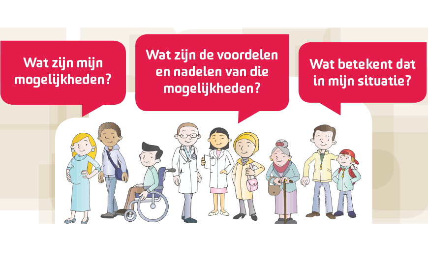 3. Wat betekent dat in mijn situatie? Uw persoonlijke situatie is belangrijk voor de keuze. Hoe is uw thuissituatie, wat is uw beroep, hoe oud bent u, wat zijn uw wensen en uw doelen? Ook voor uw arts is het belangrijk om dit te weten. Zodat hij/zij het medische advies hierop kan aanpassen.