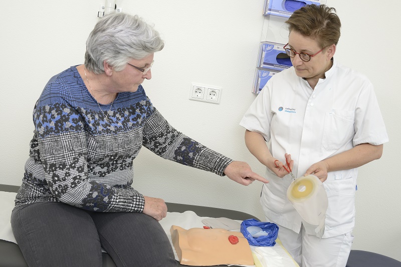 In het Catharina Ziekenhuis worden patiënten die een stoma krijgen al vóór de operatie uitgebreid geïnformeerd en gemotiveerd door stomaverpleegkundigen. Patiënten oefenen dan ook al met een nepstoma. Vanaf de dag na de operatie worden patiënten dagelijks intensief begeleid door de verpleegkundigen van de afdeling, de stomaverpleegkundigen en de chirurgen om het stomamateriaal zelf aan te brengen, te legen, te knippen en te vervangen. Ook de familie van de patiënt wordt bij dit proces betrokken. En met succes. “Bij ontslag leegt en wisselt de patiënt het stomazakje zelf en knipt en vervangt zelf het stomamateriaal”, zegt Bloemen. Als de patiënt thuiskomt, bezoekt na enkele dagen een stomaverpleegkundige van MediReva de patiënt nog één keer om de laatste controles uit te voeren en vragen te beantwoorden waar de patiënt in de thuissituatie tegenaan loopt.