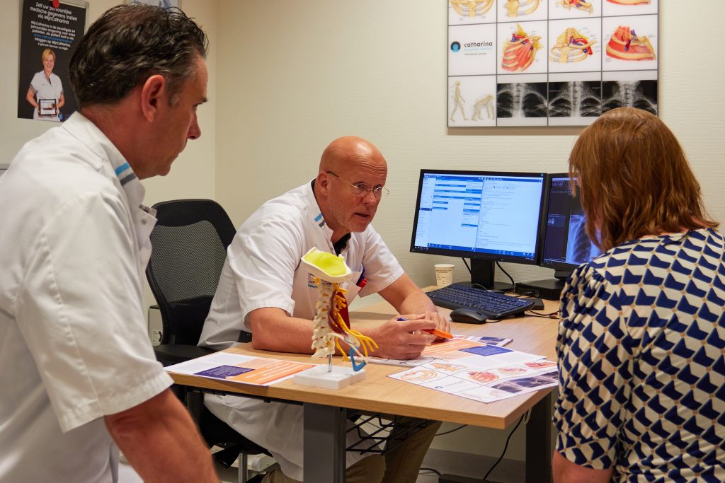 “Eén test die het syndroom kan aantonen is er niet; het gaat om een mix van onderzoeken door verschillende specialisten”, zegt Pesser. Patiënten die op de TOS-polikliniek van het Catharina Ziekenhuis komen worden gezien door een neuroloog, vaatchirurg, fysiotherapeut en een verpleegkundig specialist, die allemaal veel ervaring hebben met TOS. Bij twijfel kijkt een orthopeed of een radioloog mee. Pesser: “Zo halen we er ook soms andere klachten uit.”