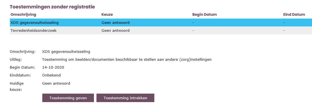- Klik onder het kopje ‘Toestemmingen zonder registratie’ op de regel ‘XDS gegevensuitwisseling’