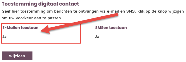 Controleer of uw e-mailadres juist is ingevuld. Staat er geen e-mailadres ingevuld of wilt u het e-mailadres wijzigen? Dit kan door te klikken op wijzigen. - Toestemming digitaal contact