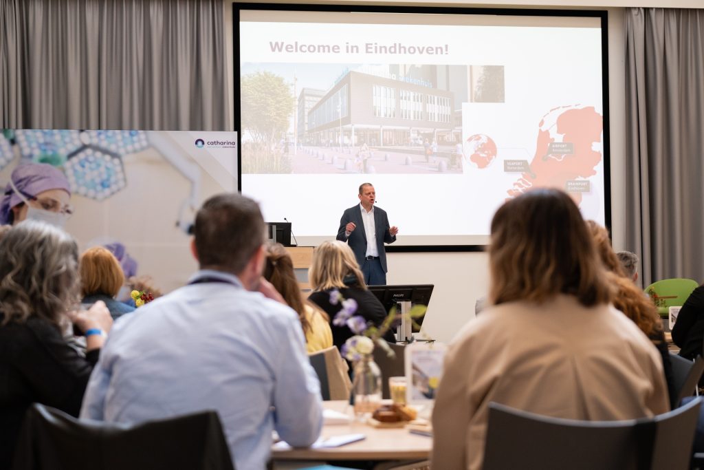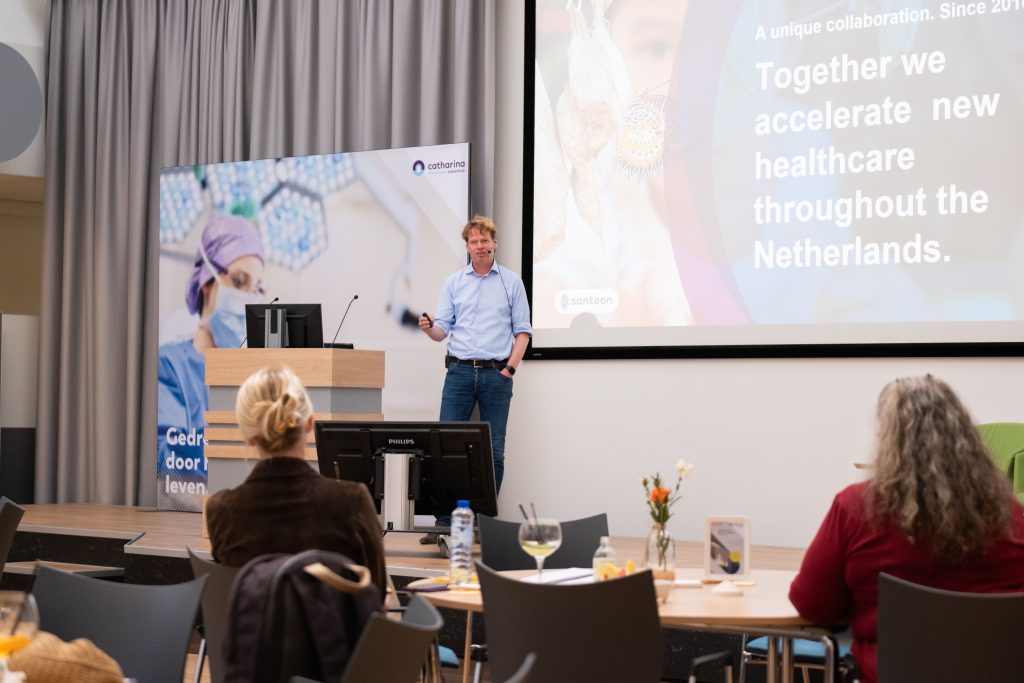Santeon-directeur Pieter de Bey vertelde hoe niet alleen het Catharina Ziekenhuis, maar ook de andere zes ziekenhuizen op deze manier de zorg vernieuwen. “We vergelijken uitkomsten en analyseren praktijkvariaties. Dat is de basis voor continue verbeteringen.”