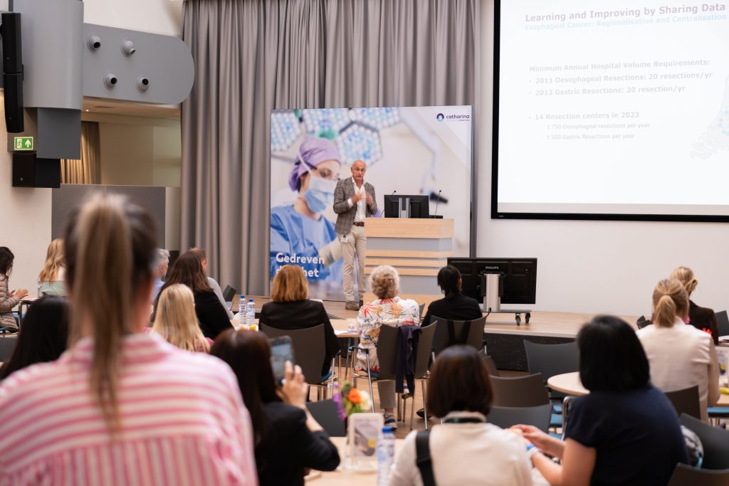 Daar bleek geen woord aan gelogen, al kun je in een dag natuurlijk niet alles zien. Vier sprekers en vijf rondleidingen op diverse afdelingen gaven wel een goed beeld van het Catharina Ziekenhuis. Oncologisch chirurg Grard Nieuwenhuijzen, gespecialiseerd in het maag-darmstelsel, legde nadruk op betere gezondheidsuitkomsten in Nederland door het onderling delen van data met elkaar. “Sinds 2017 komen we jaarlijks bij elkaar en praten we met elkaar over hoe ingrepen beter kunnen. Door simpelweg het uitwisselen van ervaringen wordt de zorg – met cijfers – bewezen beter.”