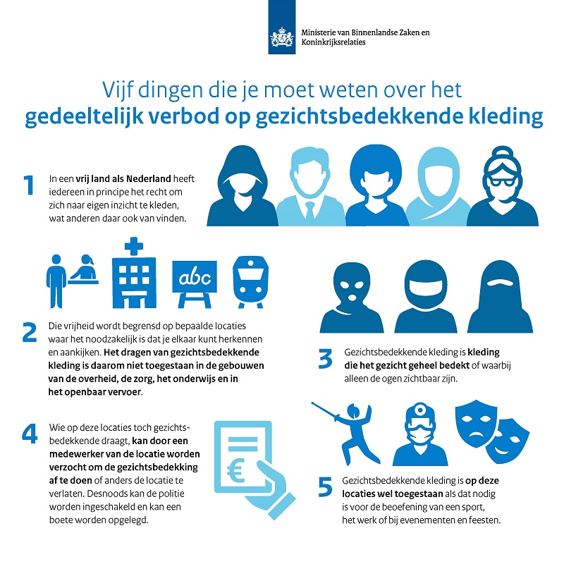 Per 1 augustus 2019 treedt in Nederland de Wet Gedeeltelijk verbod gezichtsbedekkende kleding in werking. Het verbod geldt in zorginstellingen, onderwijsinstellingen, het openbaar vervoer en overheidsinstellingen.