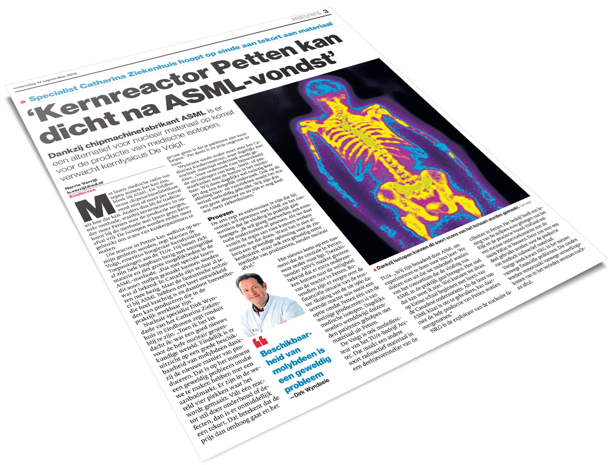 Chipmachinefabrikant ASML uit Veldhoven heeft per toeval een ontdekking gedaan die van groot belang kan zijn voor de medische wereld. Er is een nieuwe manier ontdekt om de isotoop Molybdeen-99 te creëren. Die radioactieve stof (molybdeen-99) is onmisbaar in ziekenhuizen bij de diagnose van ernstige ziektes, zoals kanker, via scans.